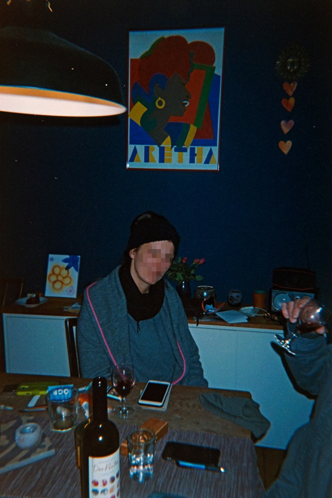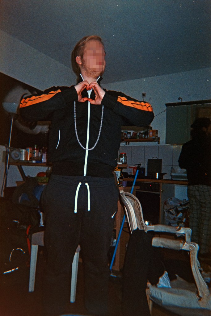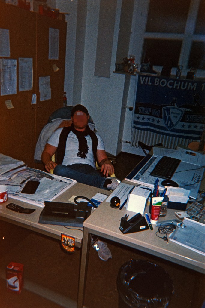 Das nächste Bild ist ein Foto von „Thommy der Tomate“, Hausmeister an einer Essener Schule, an seinem Arbeitsplatz. „Warum hast du den da besucht?“ – „Weil ich den öfter da immer besuche, einfach so. Und weil der dat richtig gut macht und der wird geliebt von allen. Und dann sitzt der da. Sitzt da einfach.“ Weiter geht es – „Zufallsbekanntschaften“. Immer wieder auch Bilder von seinem Sohn, der mit dabei ist, wenn Florian sich mit Freund:innen trifft. Ein Bekannter, das Foto entstand bei ihm zuhause.