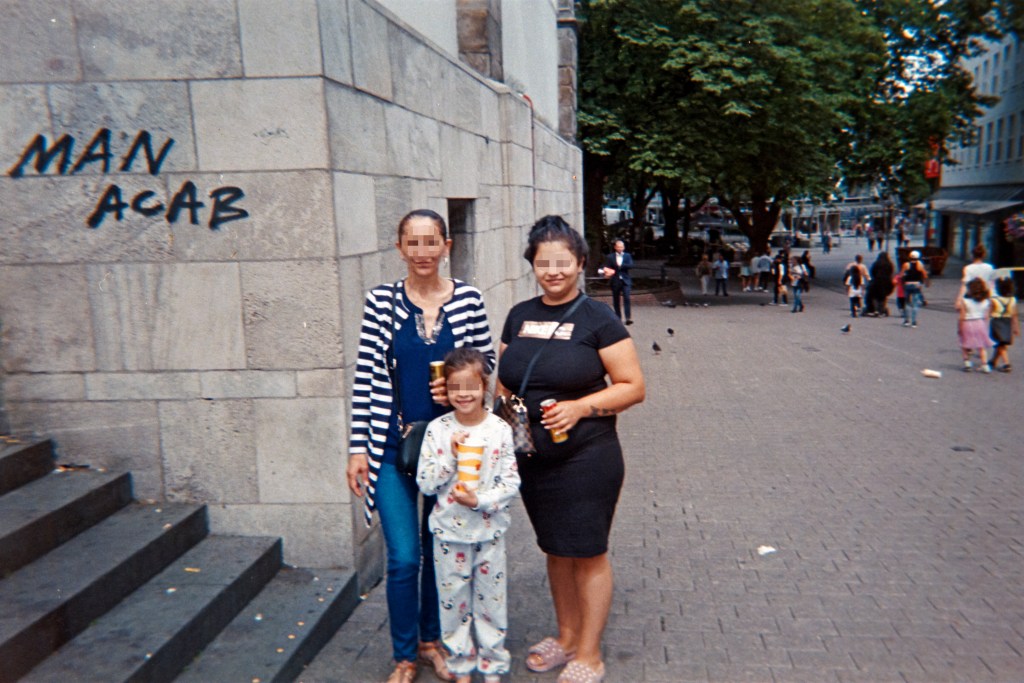 Ich zeige ihr das nächste Bild und frage, wer die Menschen auf dem Foto sind. Zu sehen ist sie mit der Tochter ihrer Schwester und einer Freundin der Mutter, erklärt Isabela. Das Bild zeigt die drei in der Innendstadt. Ist sie oft dort, frage ich. „Ja, spazieren. Von Essen Hauptbahnhof“, sagt sie. Ich frage, was sie sonst gerne in ihrer Freizeit macht. „Wenn sie nicht gerade in der Innenstadt spazieren ist, kümmert sie sich um ihr Baby oder kocht zuhause oder kauft ein“, sagt Ramadan. „Putzen“, ergänzt Isabela. Wir sprechen darüber, was sie gerne macht, was ihr Spaß macht. „Früher hat sie sehr gerne Fußball gespielt, jetzt kann sie nicht mehr.“ Hat sie in einer Mannschaft gespielt? „Hat sie nicht geschafft, leider. Sie wollte schon immer, aber hat sie nicht geschafft.“ – „Und jetzt wegen dem Kind nicht mehr?“, frage ich nach. „Sie fühlt das nicht mehr. Jetzt kümmere ich mich lieber um mein Kind“, übersetzt Ramadan. „Hat sie das Gefühl, dass sich ihr Leben sehr stark verändert hat, seit dem Kind?“, frage ich jetzt. „Ja, sehr! Aber im Positiven“, sagt er. „Gut, gut!“, fügt Isabela hinzu und strahlt. Ich frage, wie ihr Kind heißt. „Erika, ist deutscher Name“, sagt sie lächelnd. Wie kam sie auf den Namen? Sie antwortet Ramadan, schaut anschließend mich an, hält ihr Handy hoch und sagt: „Google“. Zwei Wochen vor der Geburt findet sie den Namen im Internet. „Und wer ist Eva?“, frage ich und zeige auf das Tattoo auf ihrem Unterarm – der Name eingerahmt von zwei Sternen – das mir bereits zuvor aufgefallen ist. Sie holt eins der Fotos, die wir bereits angeschaut haben, aus dem Stapel und hält es mir hin: „Eva!“ Es ist die Tochter ihrer Schwester. Auch auf dem nächsten Bild, das ich vor sie lege, ist ihre Nichte zu sehen. „Eva, spielen.“ Eva ist sechs und geht seit Kurzem in die Schule.