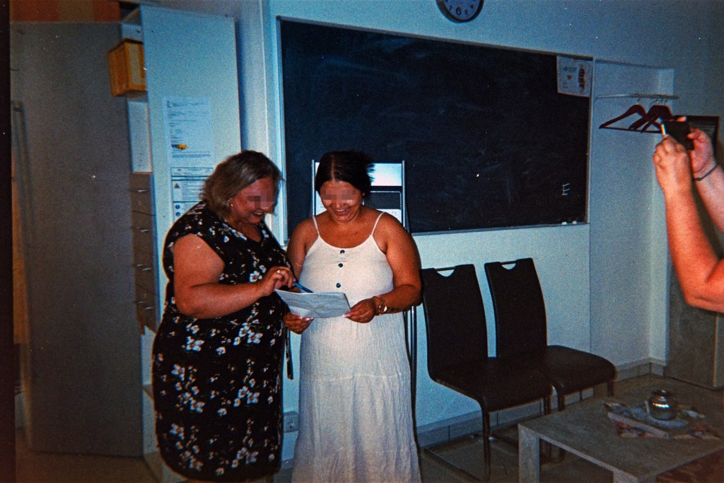 Als wir zum Abschluss des Interviews kommen, fragt Isabela, ob ich alle Bilder wieder mitnehme. Ich erkläre, dass ich die Bilder für das Projekt benötige und frage sie, ob ich ihr Abzüge machen soll. Sie nimmt den Stapel, sucht Bilder raus und legt sie mir hin: ein Foto von Erika, eins von ihrer Mutter und Eva; Isabela mit Erika auf dem Arm bei MifriN. Wir füllen das Datenschutzformular zusammen aus und ich erkläre nochmal, wie es weitergeht mit dem Projekt. Nachdem Ramadan alles übersetzt hat, frage ich, ob Isabela noch Fragen dazu hat. Sie nickt und antwortet ihm. „Wann kriegt sie die Kopien von den Bildern, die sie ausgesucht hat? Sie möchte sie gerne für ihr Zuhause haben.“