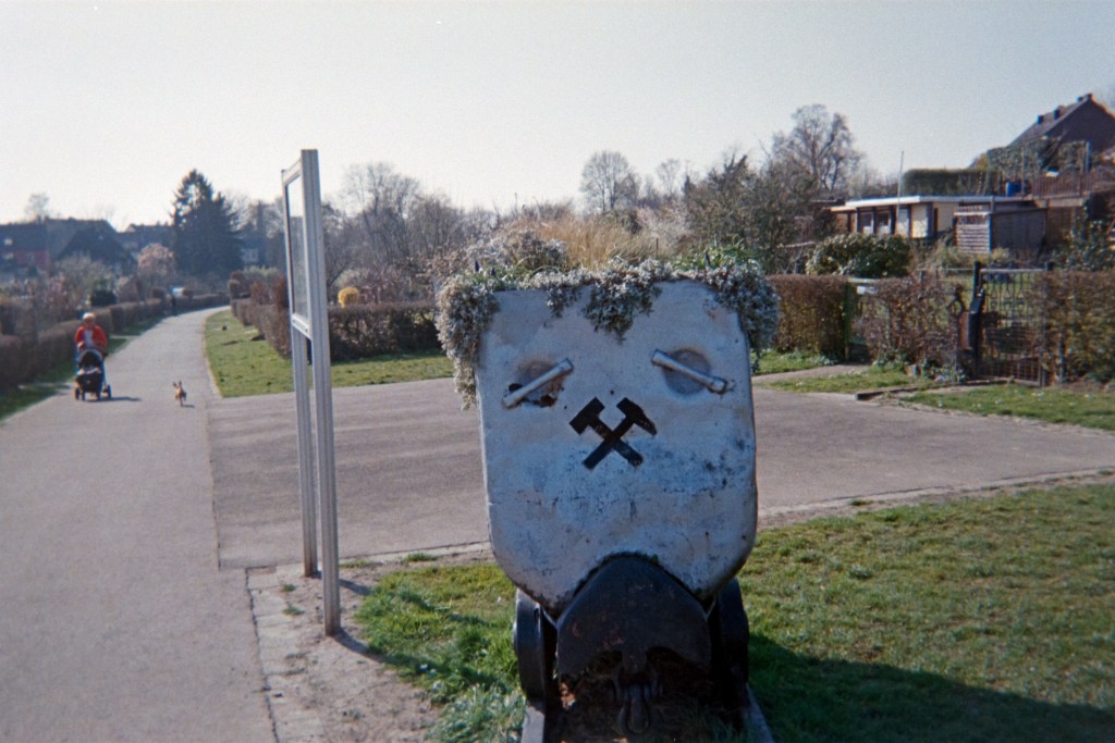 Darauf zu sehen ist eine Lore wie sie unter Tage genutzt wurde, doch anstelle von Kohle schauen Pflanze heraus. „Das ist stellvertretend für meine neue Heimat, Nordrhein-Westfalen. Das ist ja auch typisch für Essen“, sagt sie schnell, als müsse sie einen Vortrag rasch über die Bühne bringen.