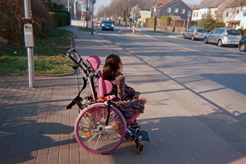 Die älteren Töchter gehen von Anfang an zur Schule, lernen schnell Deutsch. „Sehr schnell und sehr einfach, für Kinder ist das immer so. Bei uns nicht so sehr“, X lacht. Ich frage sie nach ihrer B1-Prüfung, von der sie mir bei unserem letzten Treffen erzählt hatte und die damals noch vor ihr lag. Lächelnd erzählt sie mir, dass sie bestanden hat. Ich gratuliere und frage, ob sie jetzt weitermacht mit dem nächsten Sprachkurs. „Ja, ich mache natürlich. Oder eine Weiterbildung, ich weiß nicht genau, ich muss mit dem Jobcenter telefonieren und fragen.“ Ich frage, was sie in Syrien gearbeitet hat. „Ich bin Rechtsanwältin.“ Obwohl X in Syrien studiert und gearbeitet hat, wird ihr Abschluss nur als Bachelor anerkannt. Um in Deutschland arbeiten zu können, müsste sie noch einen Master nachholen, nochmal studieren, mindestens drei Jahre. Ich frage, ob sie das machen möchte. „Zu schwierig, ich bin nicht so jung, Mitte vierzig. Und die Sprache ist für mich nicht so einfach. Und meine Tochter ist auch so klein, sie braucht viel Zeit, ich hab viel zu tun zuhause. Deswegen ich hab nicht so Zeit, um den ganzen Tag zu studieren, das ist nicht so einfach. Für einige Leute vielleicht klappt das, aber eine Frau, die hat drei Töchter und Familie und so. Nicht so einfach. Das Studium ist sowieso nicht so einfach.“ Auch für den Beruf der Rechtsanwaltsgehilfin müsste sie noch eine Ausbildung machen, auch drei Jahre, in Vollzeit. Mit der Situation ihrer Tochter ist das kaum vereinbar. Um 15 Uhr kommt sie aus der Schule und ist ab dann zuhause. „Sie kann gar nichts alleine machen. Ich muss füttern, die Windeln wechseln, und alle Sachen. Ich muss immer da sein. Geistig ist gut, aber körperlich ist schlimm.“ Sie hat die höchste Pflegestufe. Vielleicht wird die Familie zu einem späteren Zeitpunkt einen Pflegedienst in Anspruch nehmen, aktuell übernimmt X die Pflege jedoch selbst. S, die Tochter, geht auf eine Förderschule. Dort ist sie gerne, mag die Kinder und Lehrer:innen, macht außerdem Physio- und Ergotherapie, was ihr bei ihrer Erkrankung hilft.