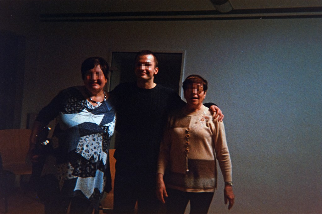 Das erste Foto ist in dem Raum entstanden, in dem wir nun sitzen. „Das ist unser Tanzlehrer und die Mädels, das ist unsere Truppe.“ Ich frage sie, wie lange sie schon hierhin kommt. Seit ungefähr vier Jahren ist sie bei der Gruppe dabei; die anderen Besucher:innen kannte sie vorher nicht. „Ich habe im Internet AWO eingegeben und Telefonnummern gekriegt und die abgeklappert. Da waren auch deutsche Gruppen, aber die haben mich sofort abgewiesen.“ Sie lacht. „Das ist aber nicht schlimm“, ergänzt sie schnell. Da sie in ihrer Familie immer nur Deutsch gesprochen hatte, dachte sie erst, es wäre gut, sich eine deutschsprachige Senior:innengruppe zu suchen. „Aber jetzt bin ich ganz froh, dass ich hier gelandet bin. Und ich wohne auch ganz nah von hier. Deswegen hat das alles ganz gut geklappt.“ Ihr Partner ist deutsch; die einzige Sprache, die sie miteinander sprechen, ist Deutsch. Auch ihr mittlerweile erwachsener Sohn spricht kein Russisch. „Wolltest du das nie, dass er Russisch lernt oder hatte er da kein Interesse dran?“, frage ich. „Mein Mann hatte kein Interesse“, sagt sie lachend und fügt hinzu: „Ich bin eigentlich Deutsche, Russland-Deutsche.“ Vor 28 Jahren ist sie ist als Spätaussiedlerin nach Deutschland gekommen. Sie wächst in einer Stadt in Sibirien auf, spricht damals zuhause nur Russisch. „Ich habe in meiner ganzen Jugend keinen deutschen Menschen getroffen.“ Bis zur Auswanderung nach Deutschland muss die Familie fast vier Jahre auf die Bearbeitung des Antrags warten. In dieser Zeit beginnt X bereits, Deutsch zu lernen. „Wortschatz habe ich schon ein bisschen gehabt in Russland und von Anfang an war das Verstehen nicht so schwer, aber sich richtig ausdrücken – bis jetzt!“, sie lacht. „Das ist doch perfekt so!“, entgegne ich. „Perfekt weiß ich nicht, aber mich kann jeder verstellen, der will.“ Wie ist es für sie, wenn sie ihre Muttersprache, wenn sie Russisch spricht, frage ich. Wie fühlt es sich an? Sie überlegt und es fällt ihr schwer, die passenden Worte zu finden. „Ich kann das nicht, die ganze Zeit nur Russisch, ich kann das nicht“, sagt sie schließlich. „Ich möchte beide nicht als einzige Sprache. Ich freu mich, dass ich hierhin komme und hier so sein kann, aber nur so… das will ich nicht.“